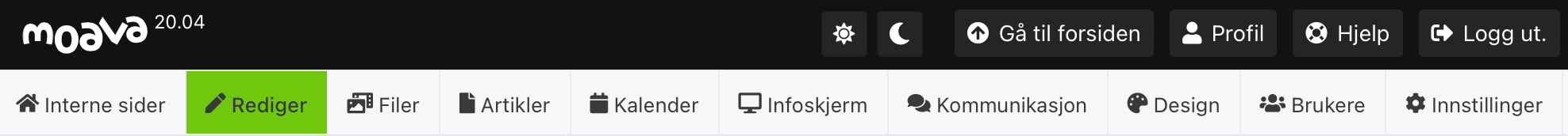 Rediger: Gir deg mulighet til å opprette og redigere meny og sider. Dessuten går du inn her når du skal opprette sideelementer og legge ut informasjon. Du får opp en liste over sidene i menyen til venstre. Ved å klikke på sidenavn, får du opp siden i hovedvinduet.