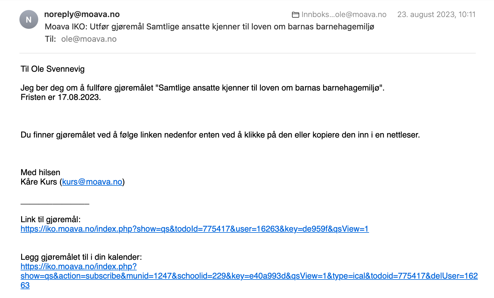 NB: Du må klikke på knappen Fullfør for at det blir registrert i systemet at gjøremålet er gjort. Det blir ikke registrert hvis du svarer på en e-post fra systemet. Evt. svar går til selskapet Moava (som leverer systemet) og ikke til enhetslederen. E-postene som er sendt deg knyttet til gjøremål ikke blir slettet automatisk selv om du har utført gjøremålet. Det må du i tilfelle gjøre selv. Skulle du få purring på gjøremål du er sikker på du har fullført anbefaler vi at du kontakter enhetsleder slik at hun kan sjekke i systemetom det er registrert utført.