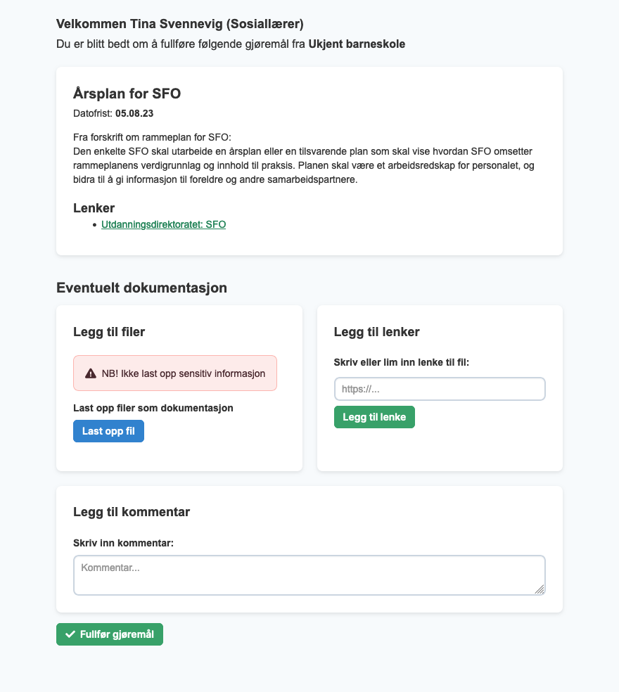 Hvis du vil kan du lese hva lovverket sier om det gjøremålet, det kan være nyttige lenker og det kan være vedlegg som kommunen/enhetslederen har lastet opp. Du kan skrive et kommentar hvis du ønsker det. Du kan også laste opp en fil som dokumenterer at gjøremålet er gjort.