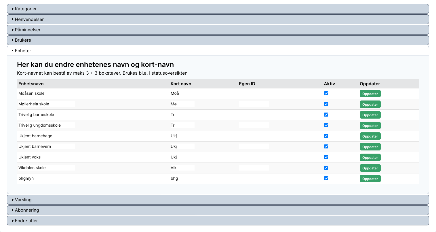 Her kan du endre navnet på en skole/barnehage, endre forkortelsen som brukes i systemet, eller gjør en skole/barnehage «inaktiv». Hvis kommunen legger ned en skole, gå inn her og ta bort haken under «Aktiv». Klikk oppdater