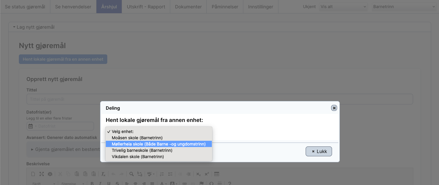 Når du er inne i «Lag nytt gjøremål» vil du finne en knapp øverst: «Hent lokale gjøremål fra en annen skole» (eller barnehage). Når du klikker på denne knappen, får du opp et vindu hvor du kan velge en skole/barnehage.