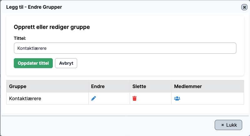 Skriv inn navnet til gruppen, og klikk Lagre. Du kan endre navnet osv. ved å klikke på Endre gruppe, og slette ved å klikke på det røde sletteikonet.