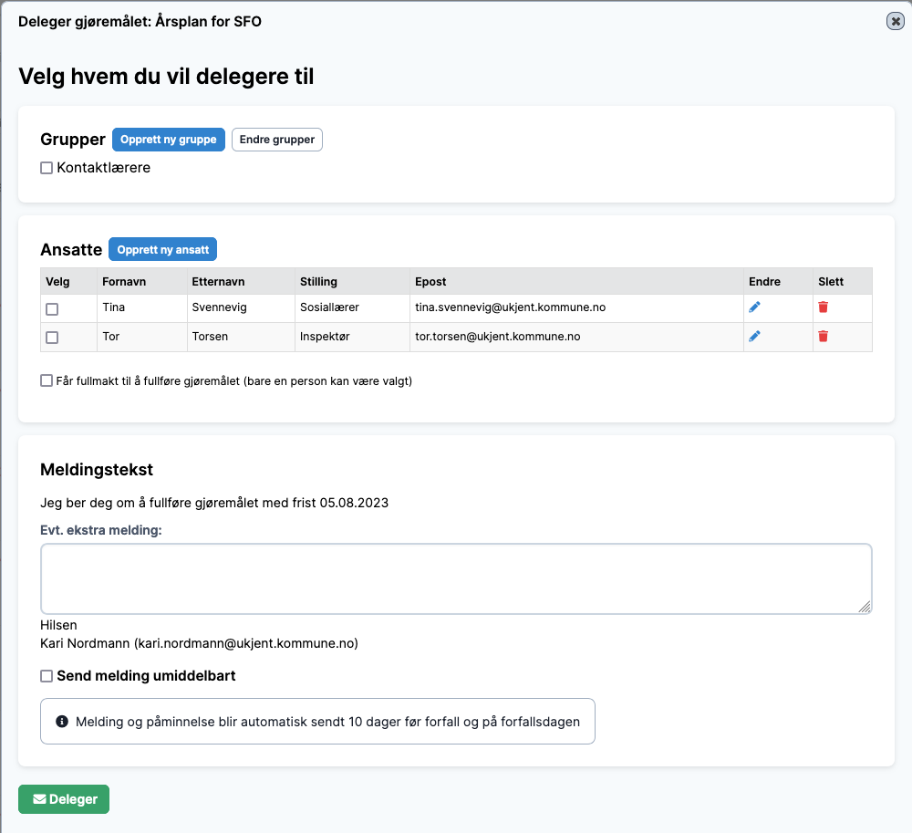 Du kan delegere et gjøremål til en annen på skolen/barnehagen ved å klikke på ”Deleger”.