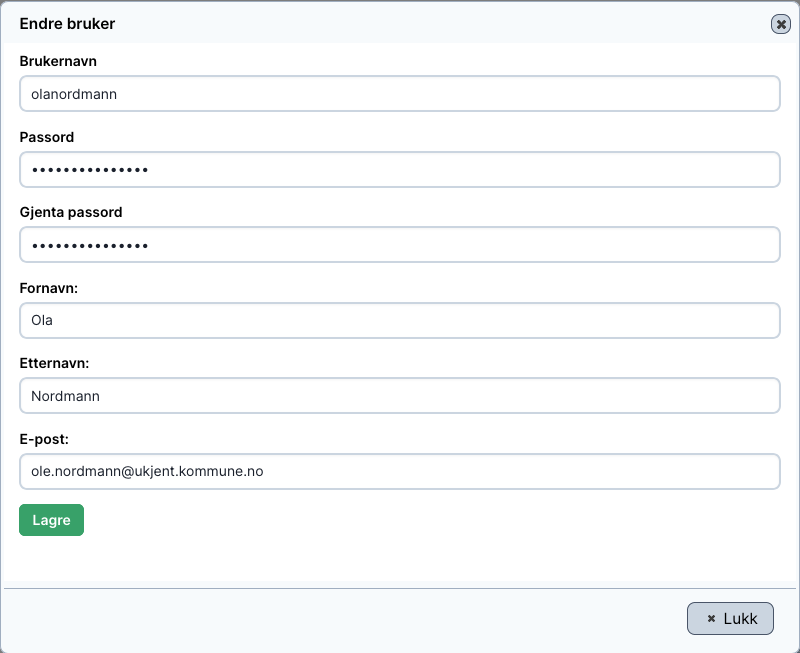 Merk at passordet må inneholde minst 5 tegn. Nåværende passord vil alltid vises med 15 prikker uansett passordets lengde, dette gjøres av sikkerhetsgrunner.