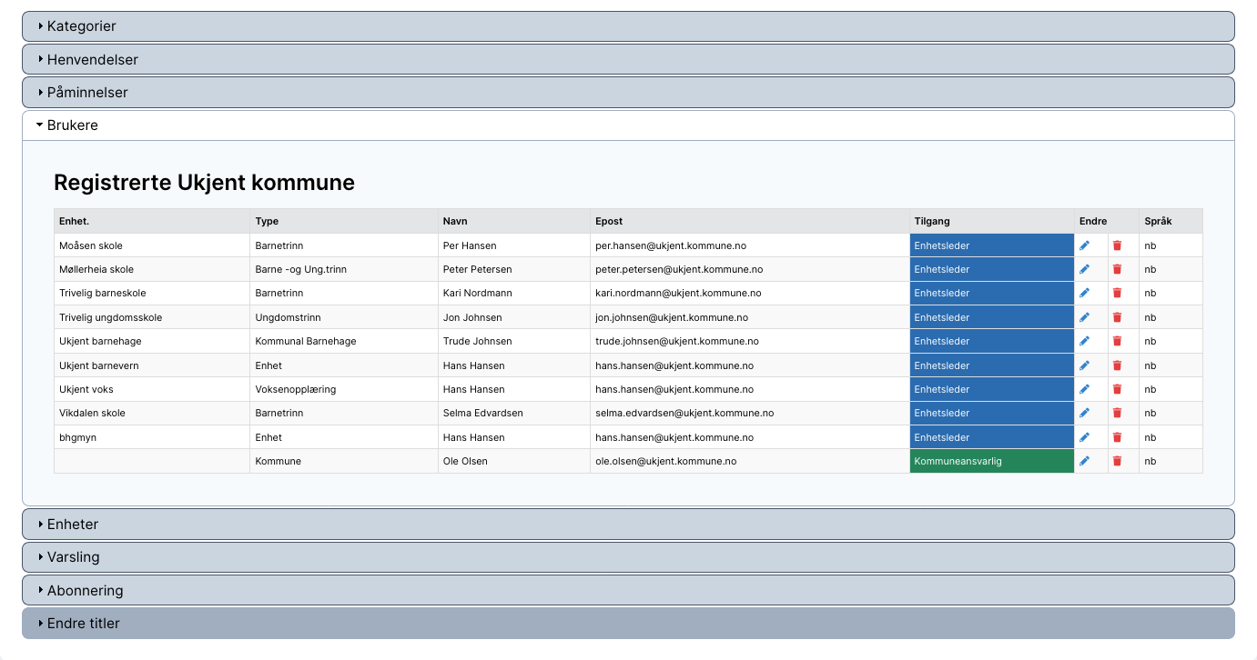Klikk først på fanen «Innstillinger». Klikk deretter på «Brukere», og du vil få opp en liste over alle brukere av systemet i din kommune.