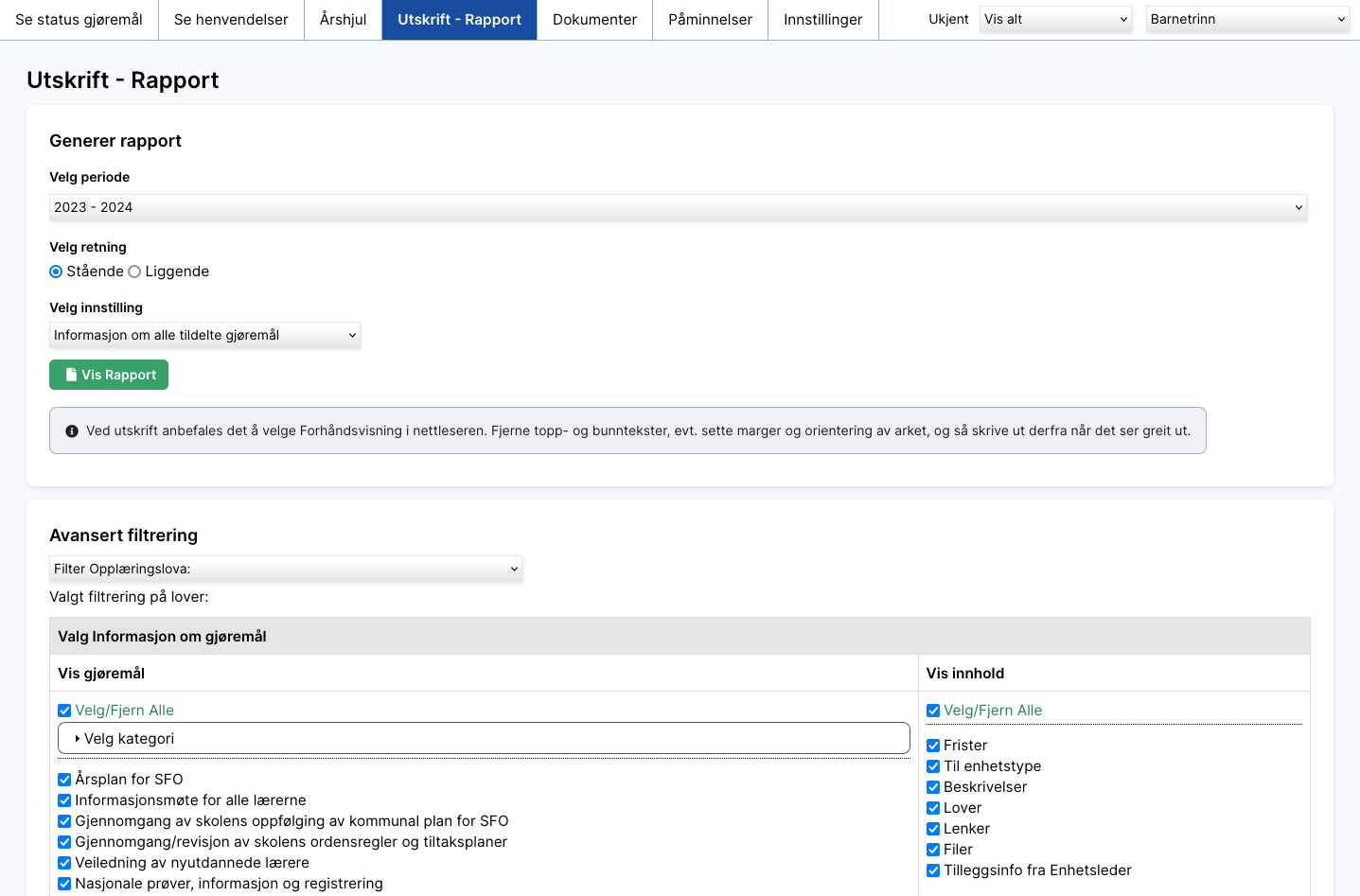 - Hvis du vil skrive ut en annen type rapport, velg en annen type. Rapporten ”Skolens egne gjøremål” (eller ”Barnehagens gjøremål”) lar deg skrive ut en rapport som forteller om skolen/barnehagen har gjort gjøremålene sine eller ikke. Her kan du også velge alle gjøremål, eller bestemte gjøremål til rapporten.