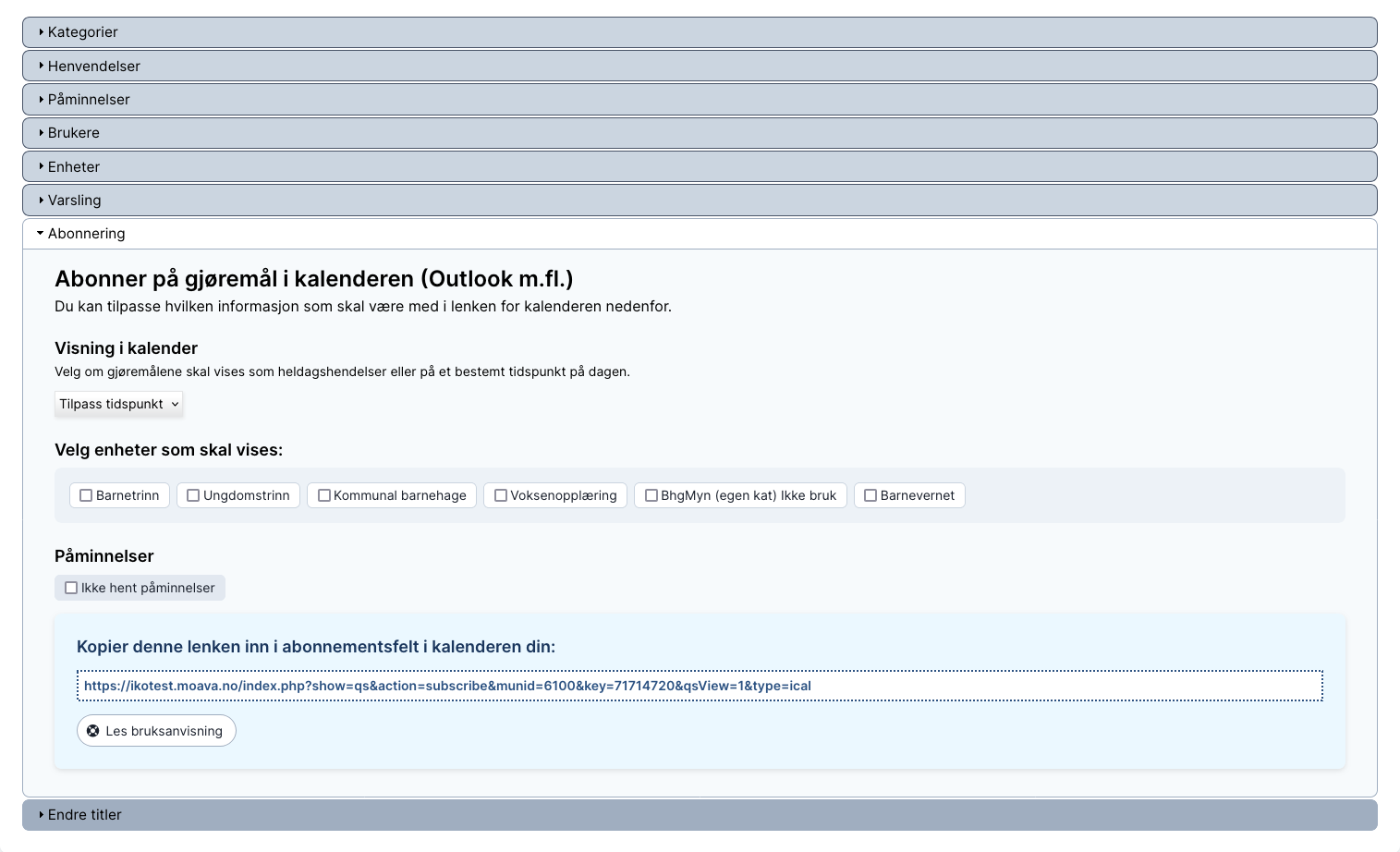 NB! Dersom du klikker på lenken og åpner den i kalenderen vil du importere en statisk kalender som ikke blir oppdatert. Dette anbefaler vi ikke dersom du ønsker en oppdatert gjøremålsliste.