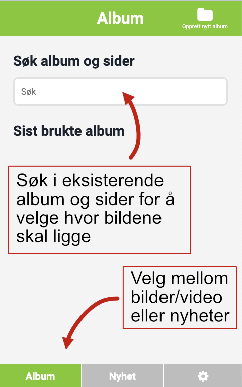 For å komme i gang kan man velge mellom å lage nytt album (øverst i høyre hjørne) eller å legge bildene i et eksisterende album (søk).