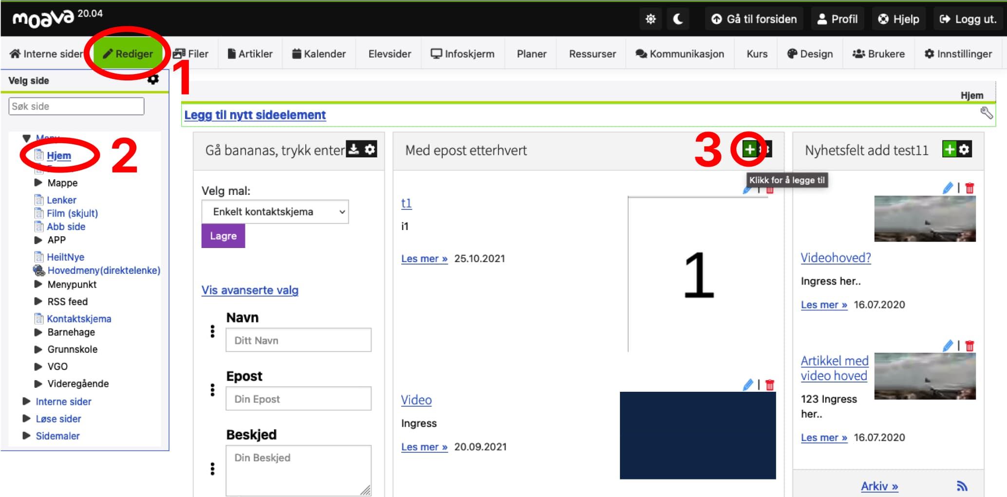 2. I menyen til venstre, klikk på sidenavnet hvor nyhetsfeltet ligger (f eks "Forsiden" eller "Hjem").