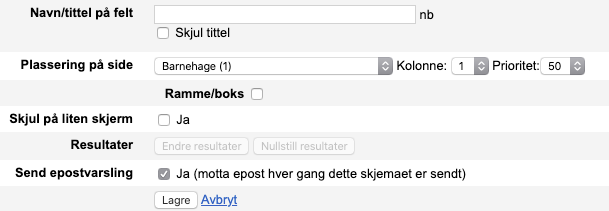 Etter at du har trykket på "legg til" får du opp et bilde hvor du kan legge til en del informasjon. Som standard vil du motta epost hver gang noen fyller ut skjemaet, meldingen går til eposten som er registrert under "innstillinger" og "Valg for nettsted".