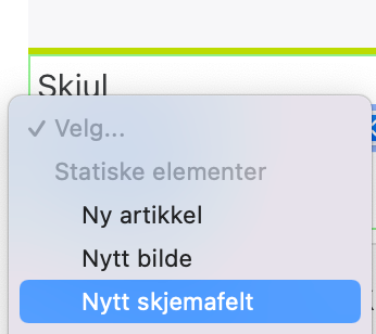 For å legge til et skjema på en side gå til "Rediger" og siden du ønsker å legge skjemaet på. Trykk så på "Legg til nytt sideelement" i kolonnen hvor skjemaet skal ligge og velg "Nytt skjemafelt".