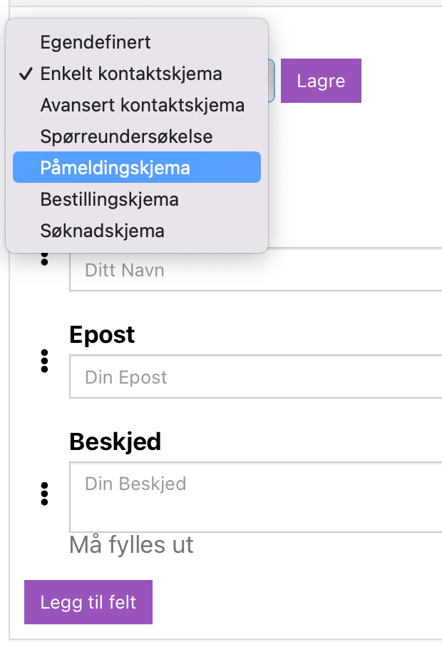 Til slutt må du gå til siden hvor skjemaet ble lagret og velge hva slags type skjema du vil ha. Her kan du også velge å legge til nye felt om du ønsker det. Her er det mange muligheter og det er kun fantasien som setter grenser:
