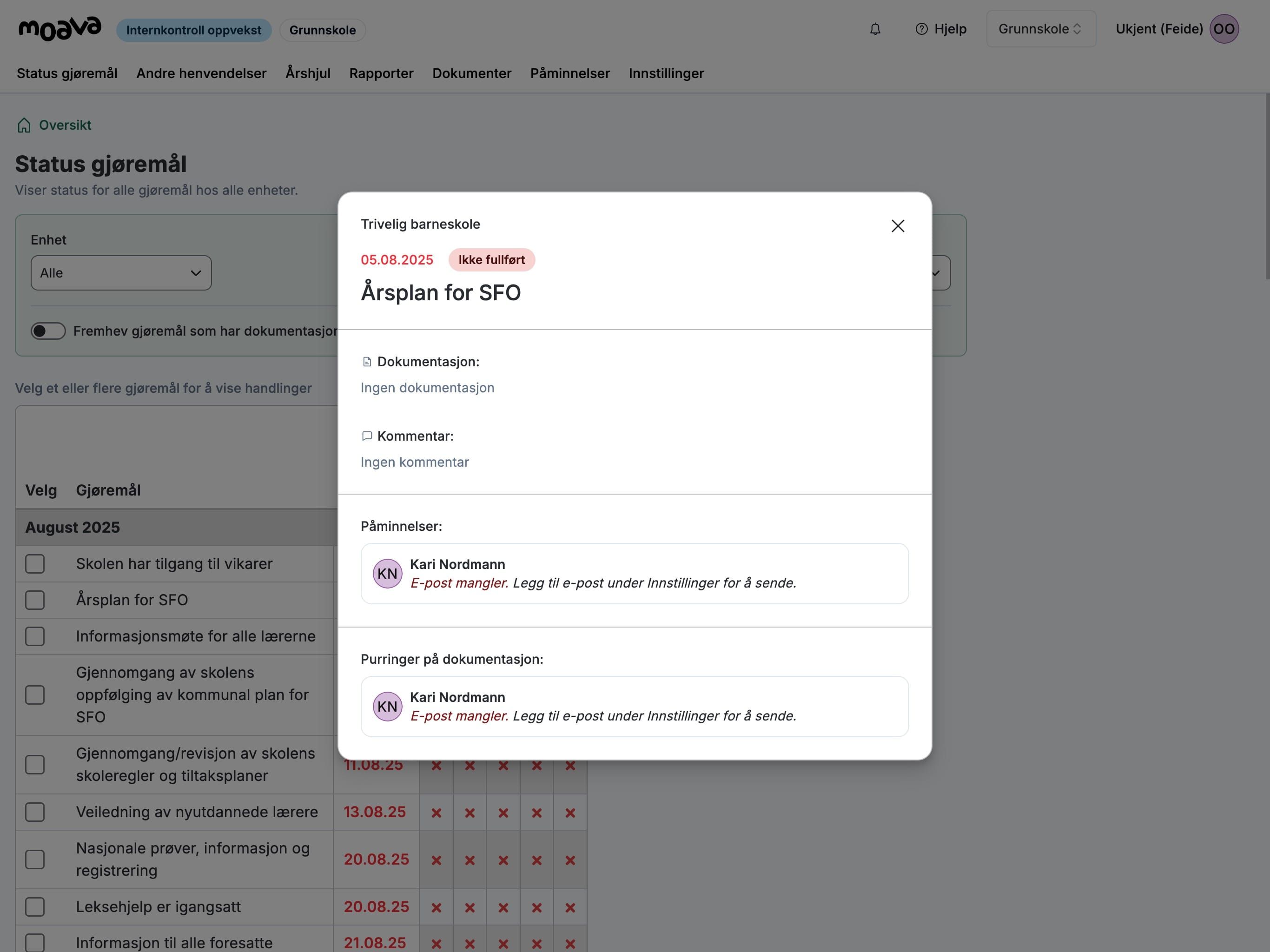 Klikk på en celle med statusikon for å sende påminnelse om å fullføre et gjøremål eller purre på manglende dokumentasjon. Du kan også markere et eller flere gjøremål for å sende til alle enhetene samtidig.