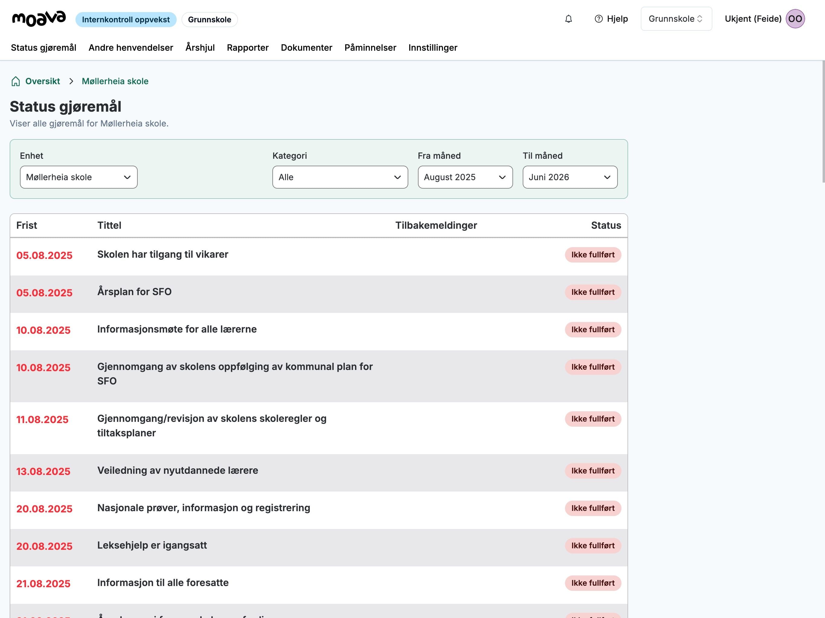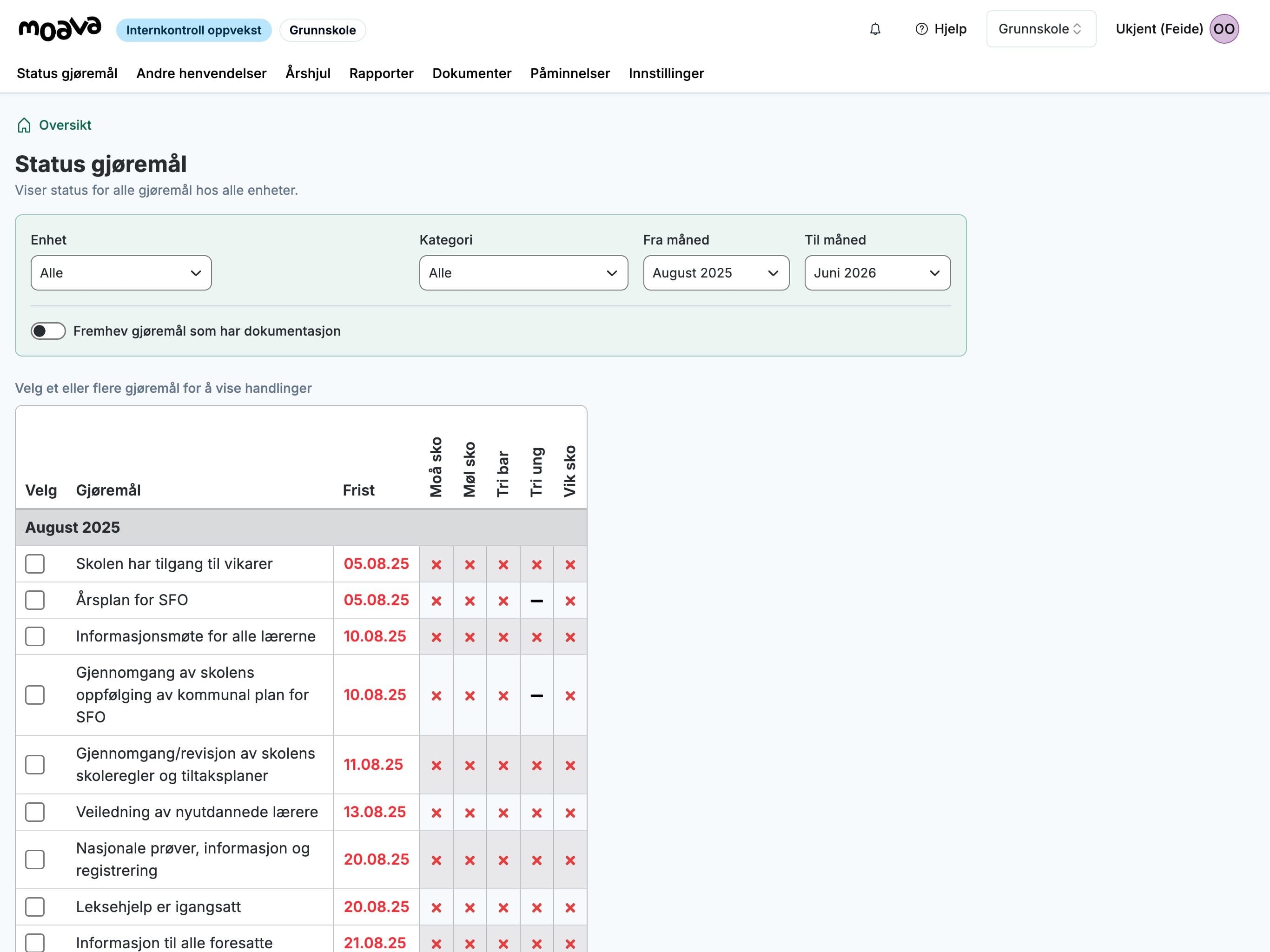 Når du logger inn som kommuneansvarlig, vises alle gjøremål i årshjulet med tilhørende frister. Frister som er gått ut, vises i rødt. Enhetene er listet opp bortover – klikk på pilen ved «Bytt visning» for å bytte mellom skoler, barnehager og andre enhetstyper.
