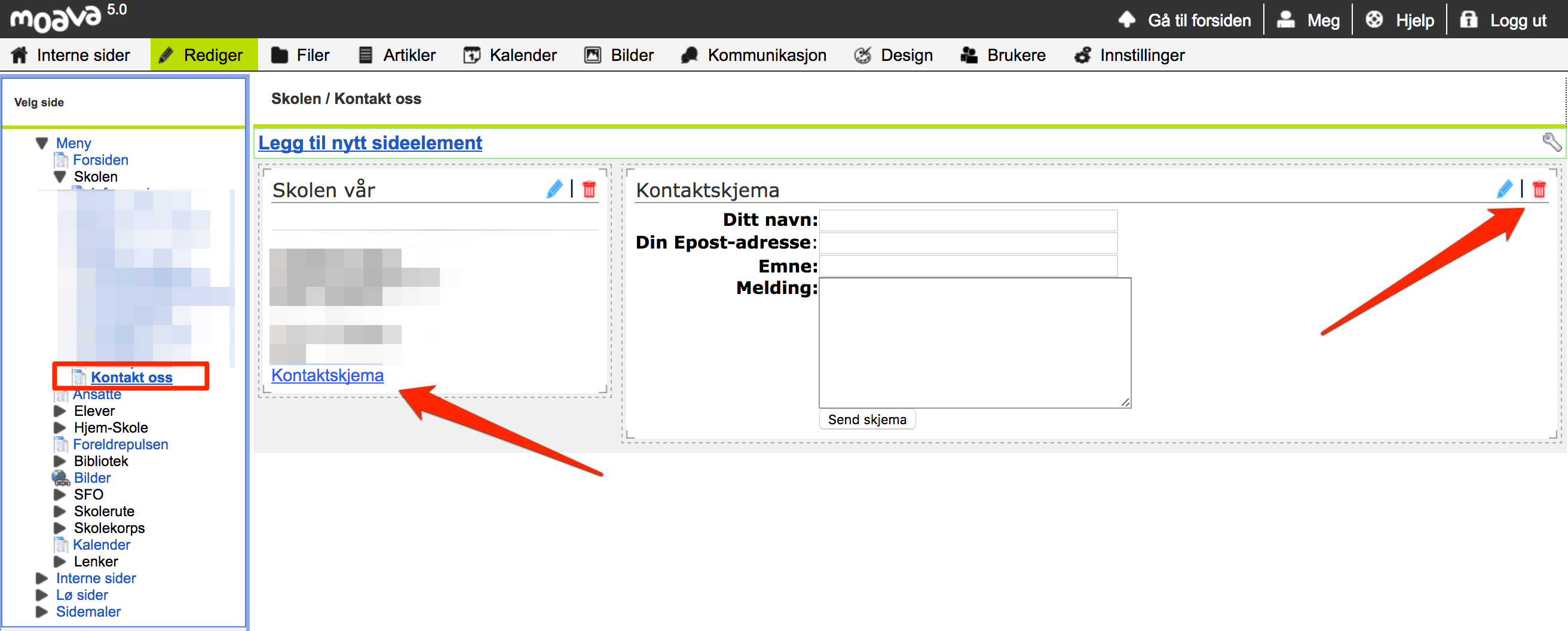 4. Når det gamle kontaktskjemaet er fjernet går man til siden hvor kontaktskjemaet lå før (eller en ny side om man ønsker det) og trykker på "legg til nytt sideelement" og velger "nytt skjemafelt" og deretter "lagre".