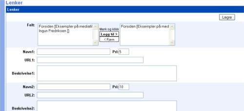 "Pri:" Dette er prioritet. Hvis du har valgt at lenkene skal sorteres etter prioritet, kan du velge tallene her. 1 er toppen av siden, og 100 er bunnen av siden. Du kan bruke tall for å "rangere" lenkene i lenkefeltet.