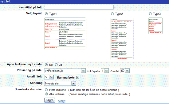Skriv inn navnet til feltet. Velg layout på lenkefeltet. "Åpne lenkene i nytt vindu": Hvis du vil at lenkene skal åpnes i et nytt vindu i nettleseren, velg dette. Velg hvilken side feltet skal plasseres på. " Kol./spalte" lar deg velge hvilken kolonne den skal plasseres i, og Prioritet lar deg lage en rekkefølge for elementer i samme kolonne - elementer sorteres fra 1 (topp) ned til 99 (bunn) i hver kolonne. "Antall i felt" lar deg velge hvor mange elementer som vises i feltet. Besøkende får tilgang til resten av lenkene ved klikke på ” Vis mer” i bunnen av feltet.