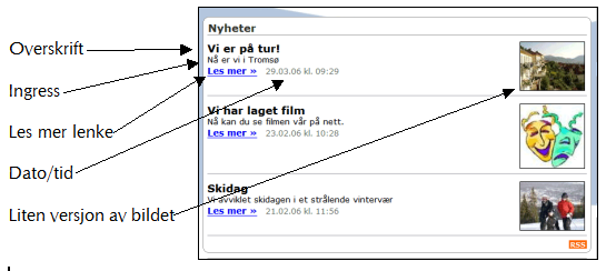 Den siste nyheten kommer alltid på toppen av nyhetsfeltet, og når det kommer flere og flere nyheter, blir de eldste nyheter lagt automatisk i et arkiv. Du definerer selv hvor mange nyheter som skal vises i nyhetsfeltet. Et nyhetsfelt kan se slik ut: