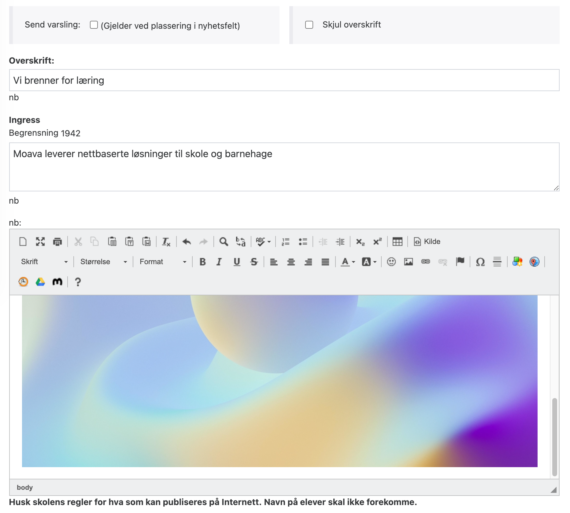 Legg merke til at det står “ Send varsling” over “ Overskrift”-feltet. Hvis denne er merket av, vil en automatisk melding bli sendt til alle som abonnerer på nyheter fra skolen, hvor det står at en ny nyhet har blitt lagt ut på skolen din.