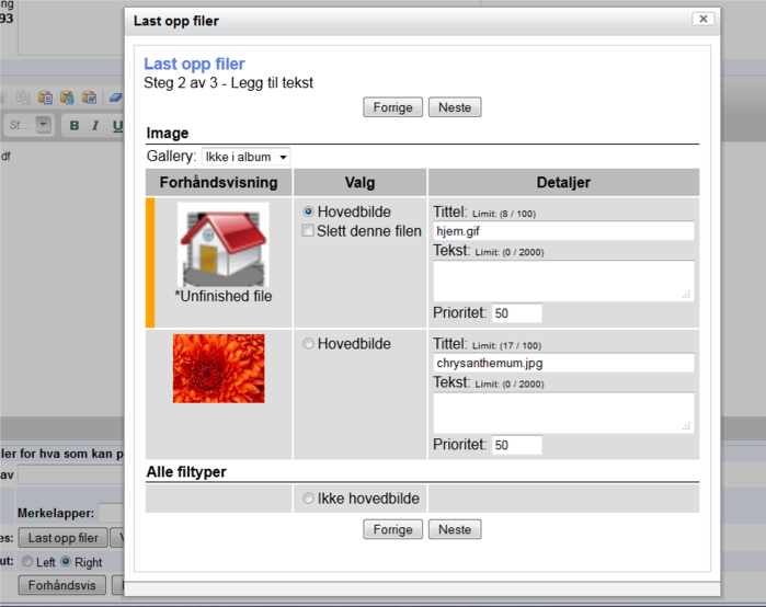 Her kan du velge om et bilde skal være " Hovedbilde" - dvs. at bildet vises som ingressbilde i nyhetsfeltet,