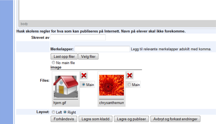 NB: Alle bilder/filer du vil publisere på skolens nettsted må lastes opp til serveren. Hvis du finner et bilde på Internett, eller på din datamaskin, og bruker ” Klipp&Lim”-funksjonen til å kopiere og lime inn bildet i teksteditoren, vil du se bildet der og da, men når du publisere artikkelen vil ikke dette bildet vises.