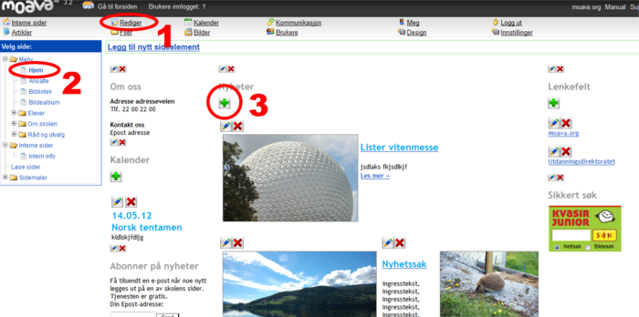 2. I menyen til venstre, klikk på sidenavnet hvor nyhetsfeltet ligger (f.eks "Forsiden" eller "Hjem").