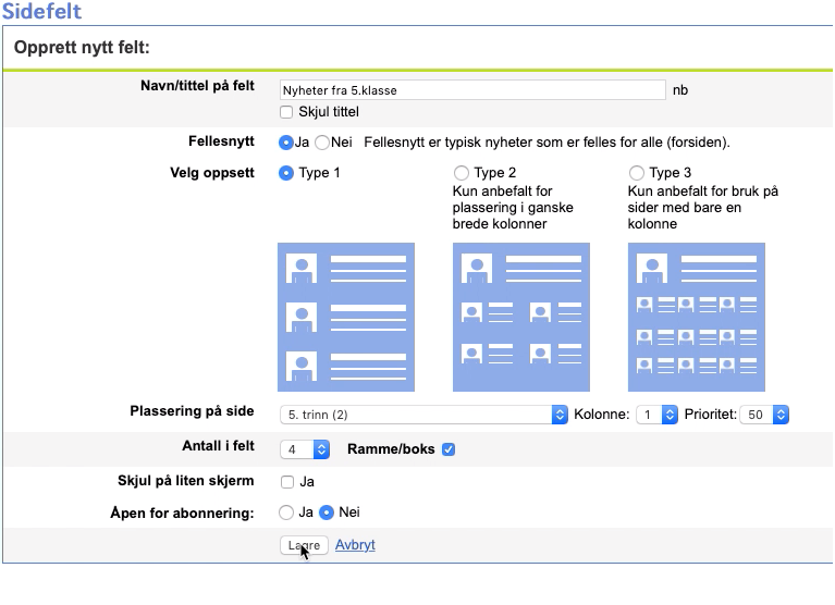 Navn/tittel er det du vil kalle feltet for, f eks ”Nyheter”, ”Nyheter fra 5.klasse”, e.l.. Du kan velge fra tre forskjellige "layout". En forutsetning for å bruke disse er at du har nok plass i kolonnen/