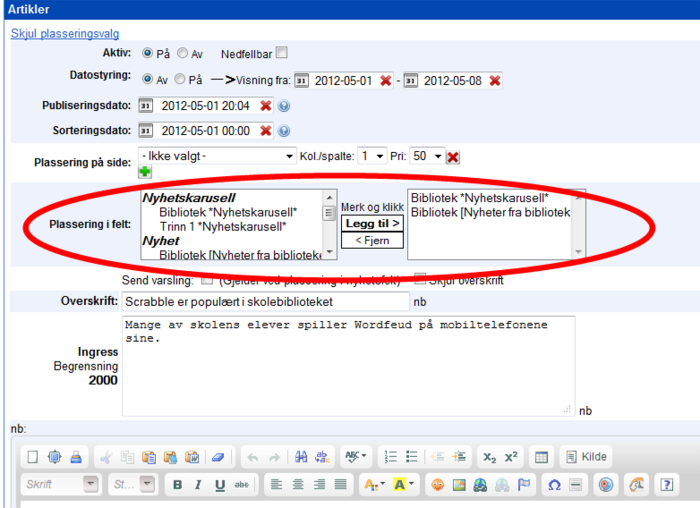 Når du skrive nyheten, og vil plassere den både i nyhetsfelt og nyhetskarusell, klikk på " Vis plasseringsvalg",