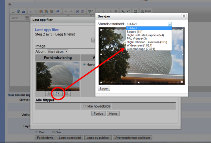 Klikk på " Beskjær"-knappen, og så velg det samme størrelsesforhold som du har på nyhetskarusellfeltet.