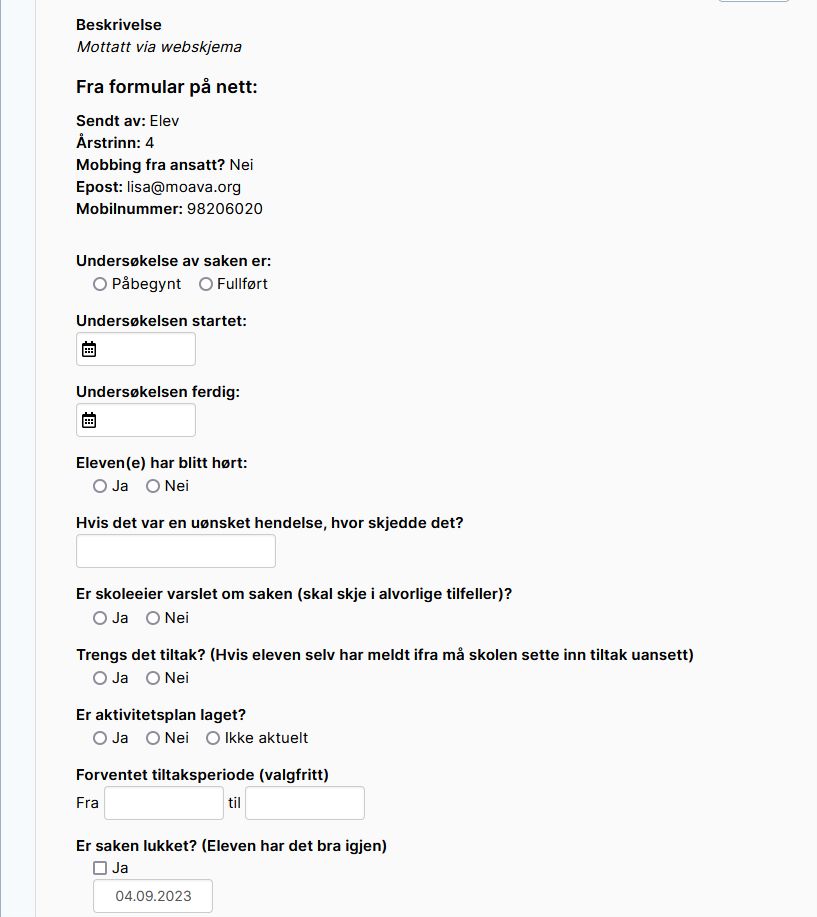 Når en elev/et barn, foresatt, ansatt eller andre person sender inn skjemaet, får du en epost med infoen de har lagt inn i skjemaet. Samtidig får vedkommende en kvittering på epost og SMS som forklarer rettighetene til eleven/barna og klageadgang (hvis det gjelder skole).