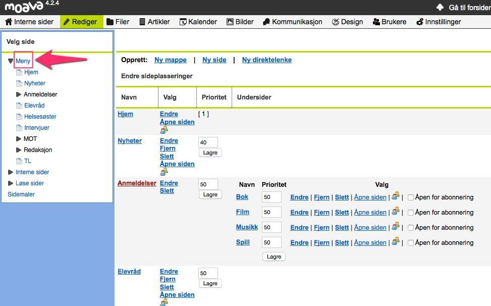 For å flytte eller slette en side, mappe eller direktelenke fra menyen trykker man først på "rediger". Deretter på ordet "meny" på venstre side. På høyre side vil man da få opp hele menystrukturen. Samme fremgangsmåte gjelder om man vil "slette", "endre" eller "fjerne" en side eller mappe.