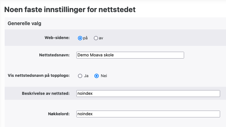 Når du får en helt fersk nettside fra Moava står det "noindex" i begge feltene, dette er for at søkemotorer ikke skal finne deg før du er helt klar med nettsiden din, dette bør fjernes så snart som mulig.