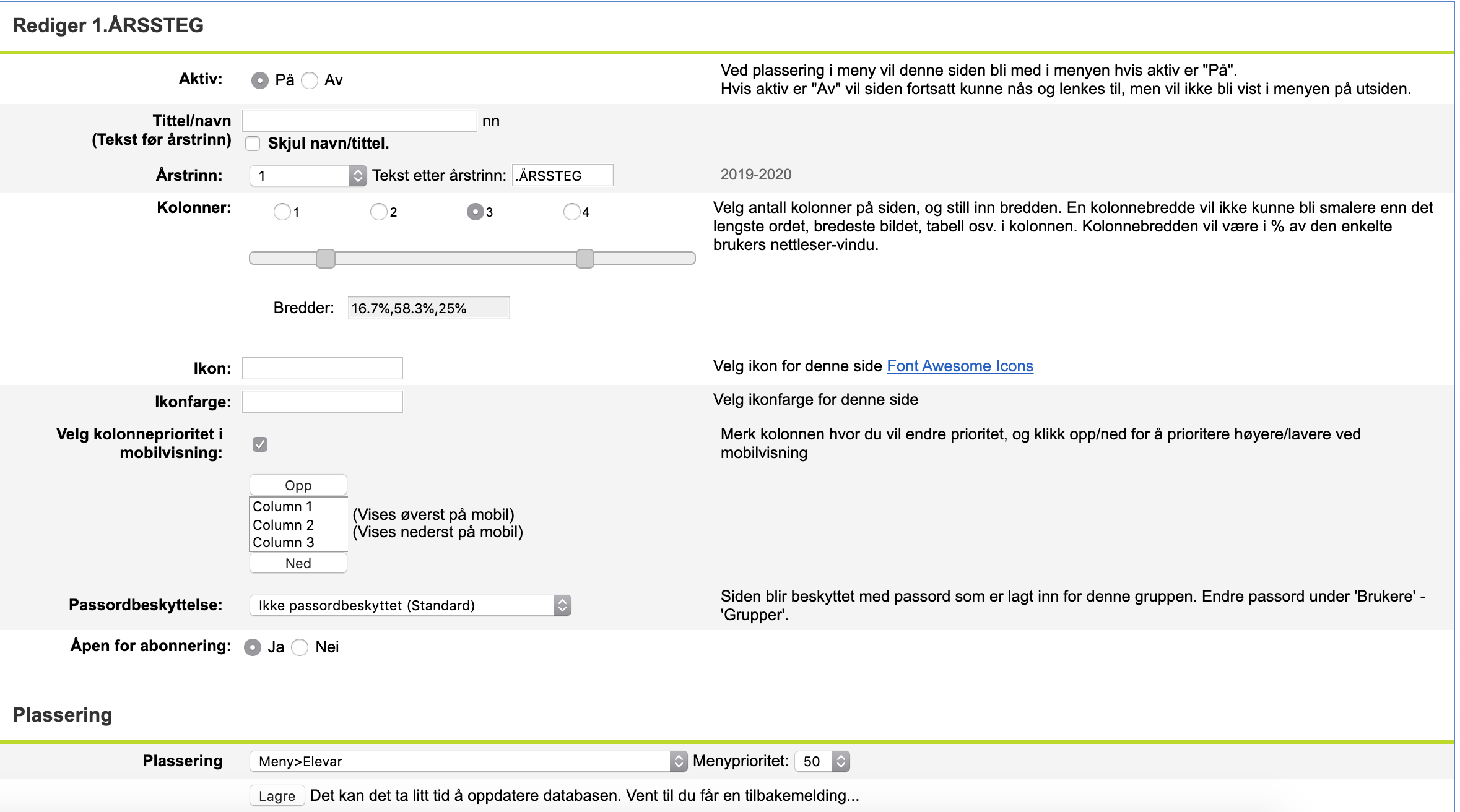 For å sjekke om en side er lagt inn med årstrinn kan du trykke på “rediger” og deretter ordet “meny” på venstre side. For at trinnsiden skal fungere så må det være valgt årstrinn i nedtrekksmenyen ved tittelen på siden. Benevnelse som trinn, årstrinn eller klasse kan stå før eller etter året. Helt opp til deg. Samme bilde vil du forøvrig se om du skal opprette nye sider.