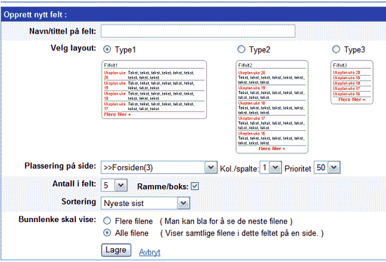 Skriv inn navnet du vil gi feltet. Velg layout."Plassering på side" lar deg velge hvilken side feltet skal vises på."Kol./spalte" lar deg velge hvilke kolonne den skal plasseres i, og Prioritet lar deg lage en rekkefølge for elementer i samme kolonne - elementer sorteres fra 1 (topp) ned til 99 (bunn) i hver kolonne. "Antall i felt" lar deg velge hvor mange filer som skal vises i feltet, før man må klikke på ” Vis flere” for å se flere filer.