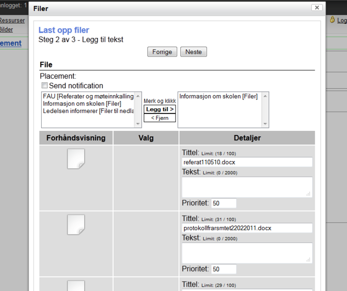8. Hvis du merker av for ” Send varsling”, vil alle som abonnerer på dette feltet få en automatisk e-post hvor det står at det er lagt ut en ny fil i feltet.